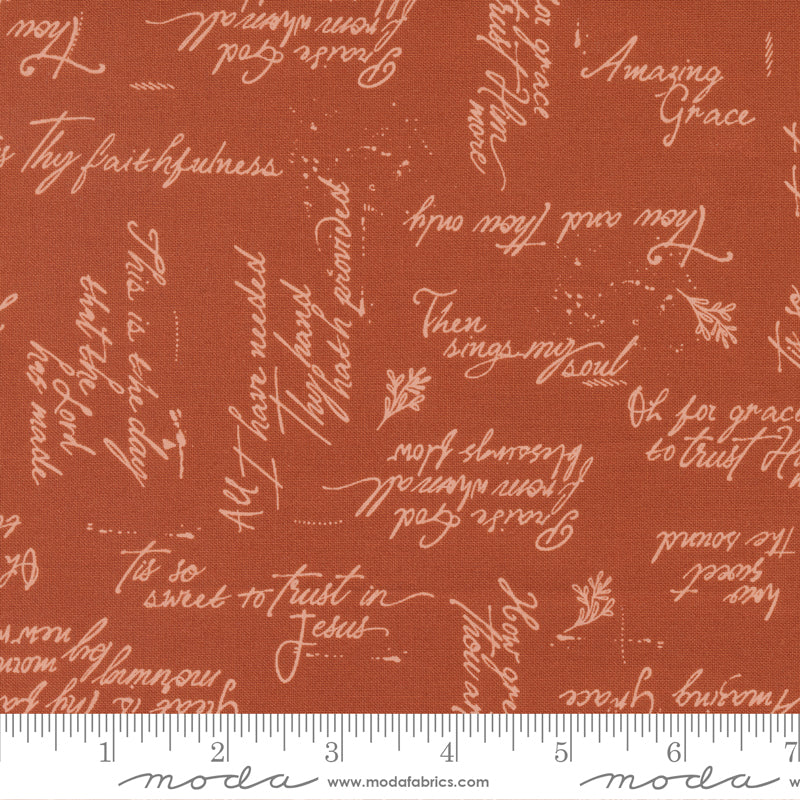 Sweet hymn print features noted verses in a peach colored script on a rust orange background.