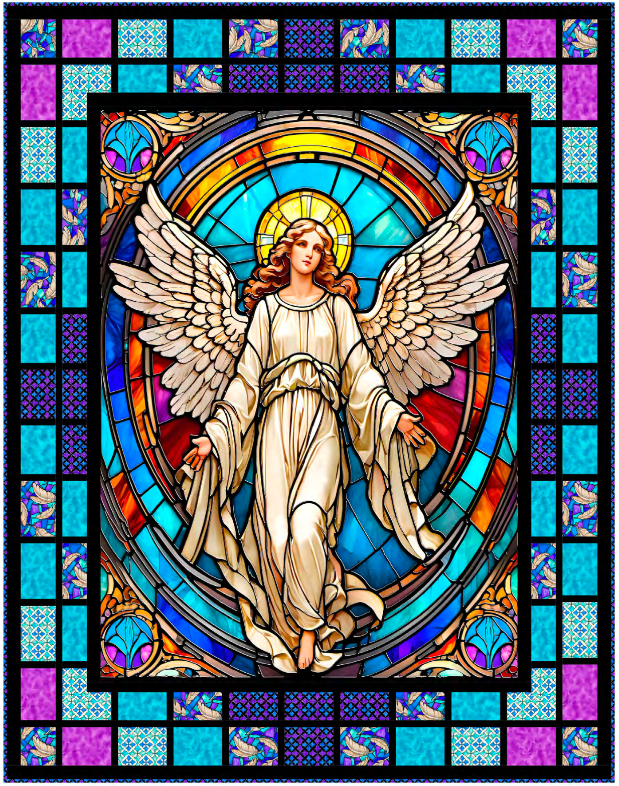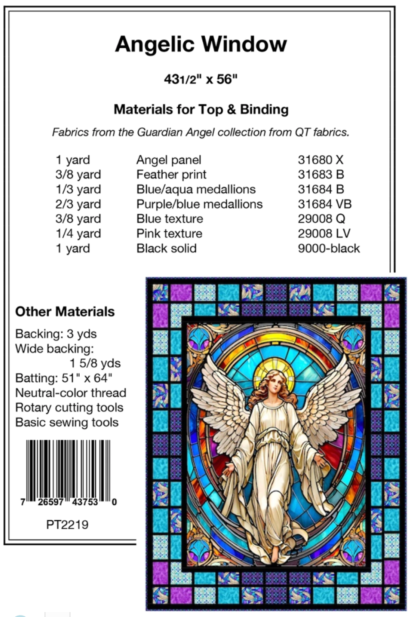 Create a beautiful stained glass window quilt with this pattern & a yard size panel.  Shown using the Guardian Angel Fabric Collection.  Strip sets make this glorious frame quilt surprisingly easy to put together.
