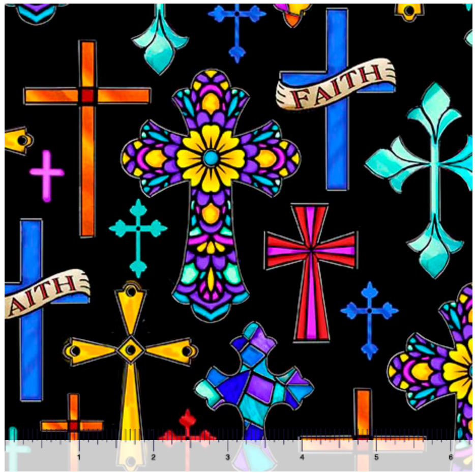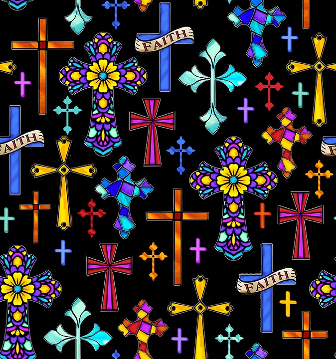 The beauty of stained glass shines bright on fabric in dramatic design and shading of this cross print with a tan background.